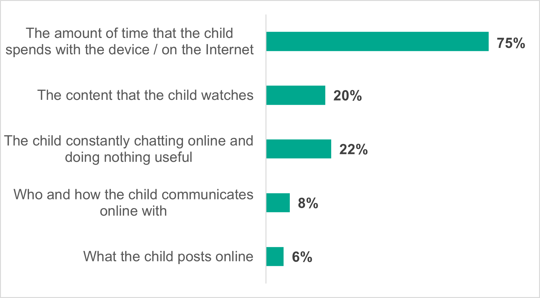 Going deeper into the reasons behind the conflicts between parents and their children, most of them emerge because of the amount of time that the child spends with the gadget (in 75% of cases). The content that a child watches is the reason for 20% of conflicts of those surveyed. Parents are also often annoyed by their children constantly chatting online and doing nothing useful – this provokes 22% of arguments.