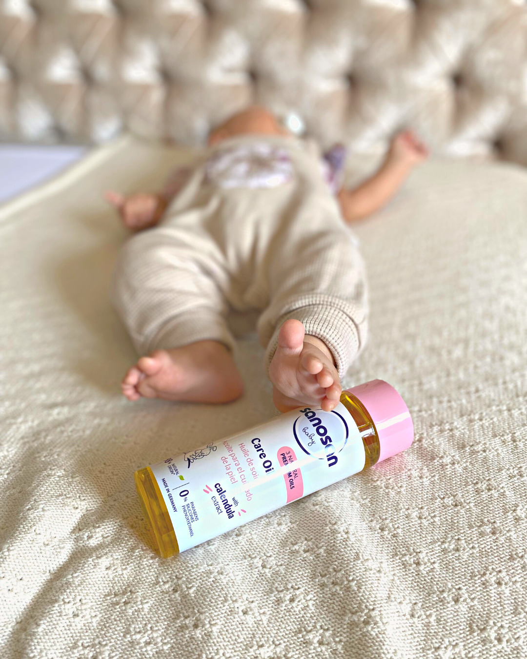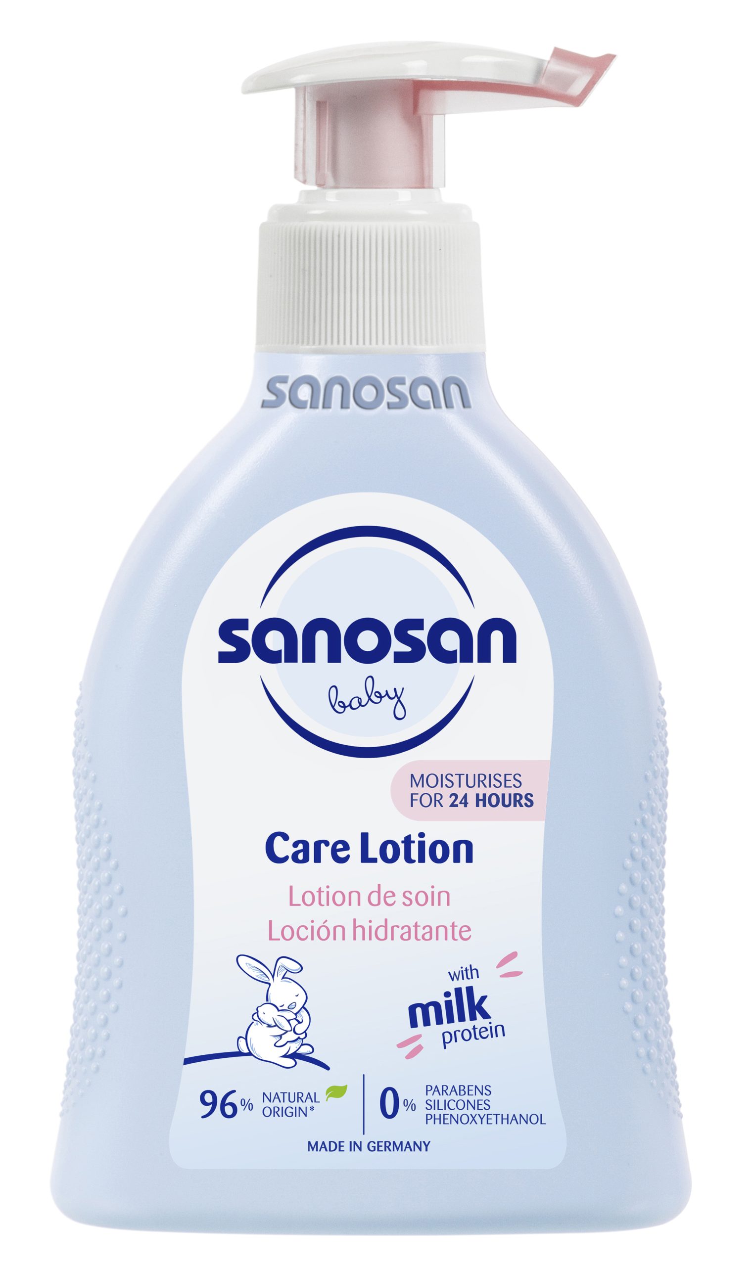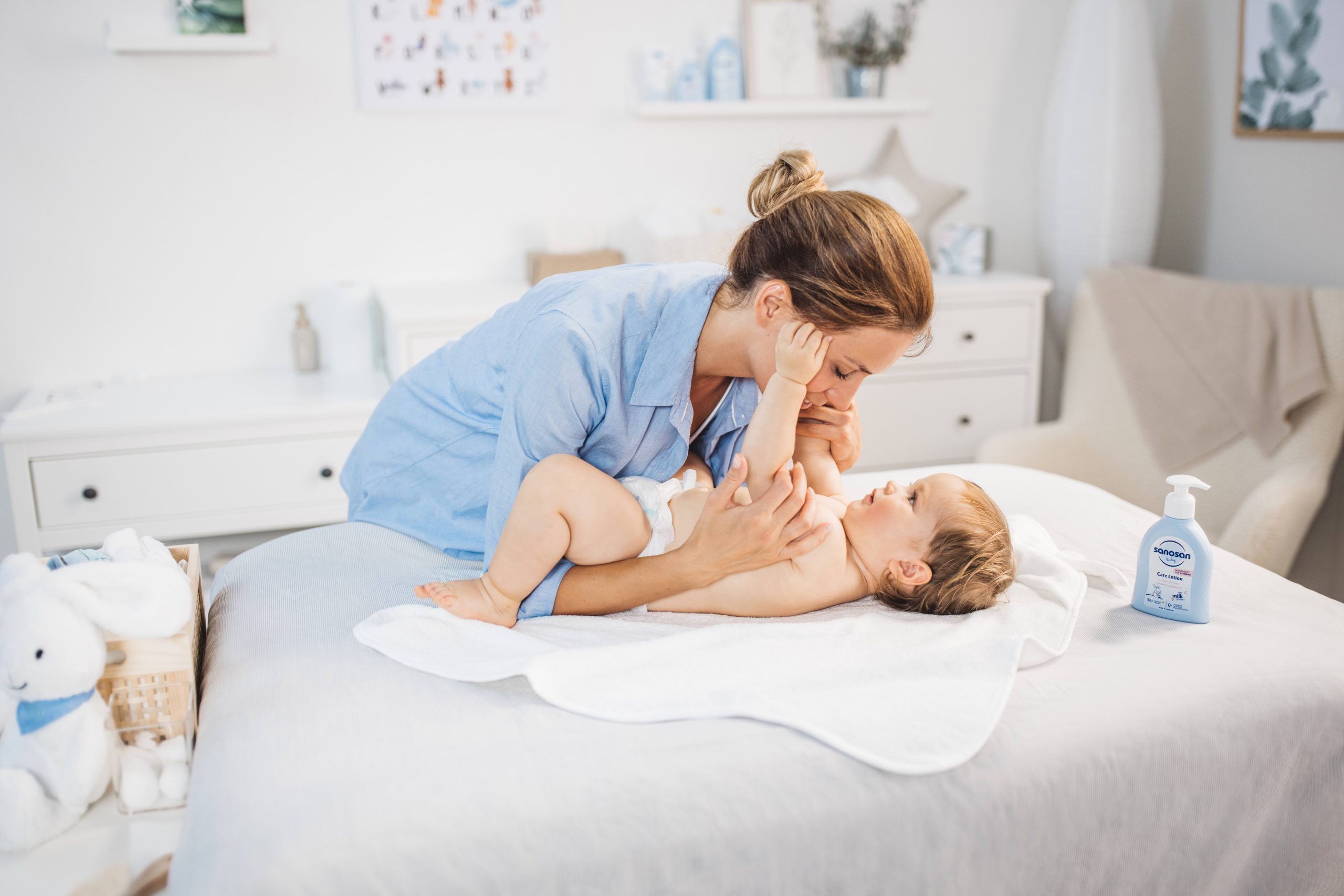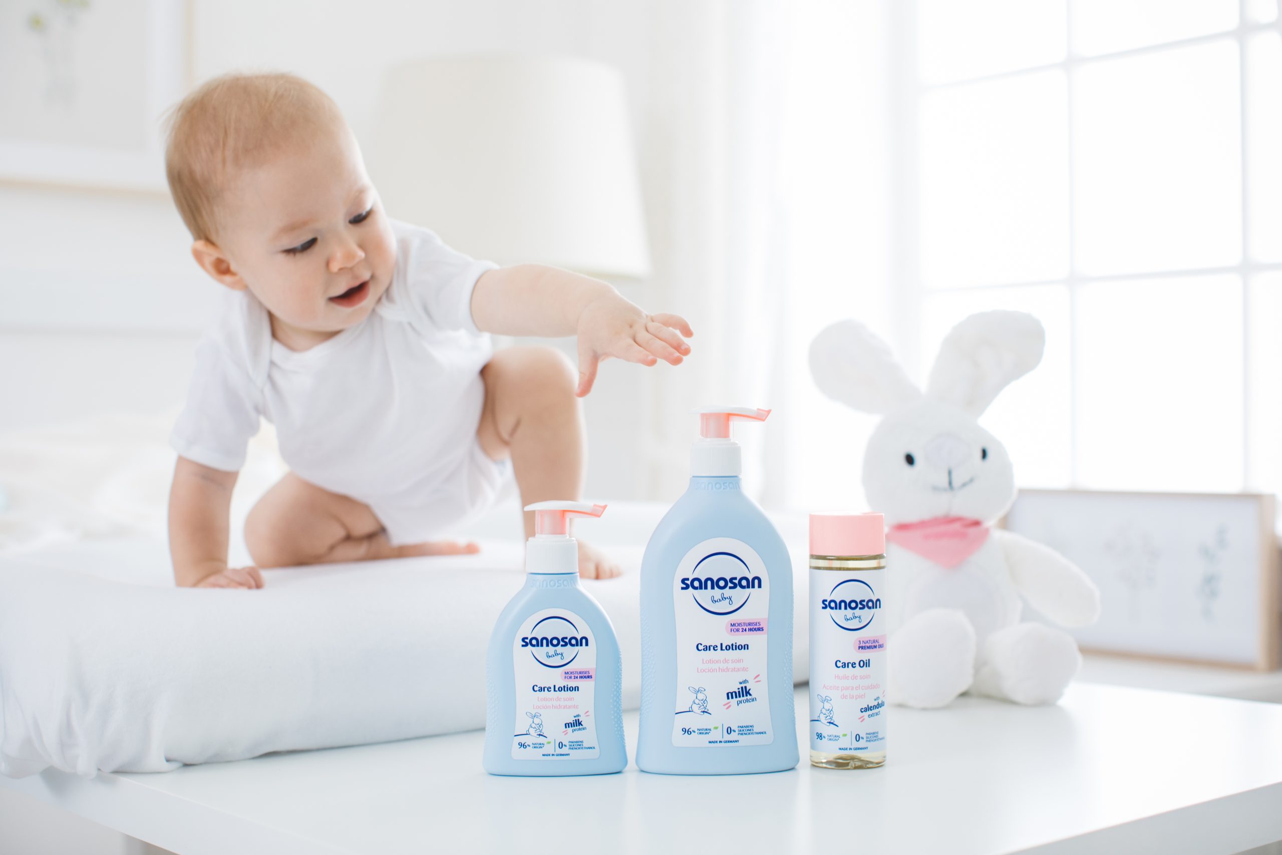 Post-bath is the perfect time to moisturise your baby’s skin. Applying a light layer of product like Sanosan Baby Care Lotion, provides 24-hour hydration, thanks to its natural milk protein, organic olive oil, and chamomile extract. These ingredients soothe and nourish while forming a protective barrier to lock in moisture.
