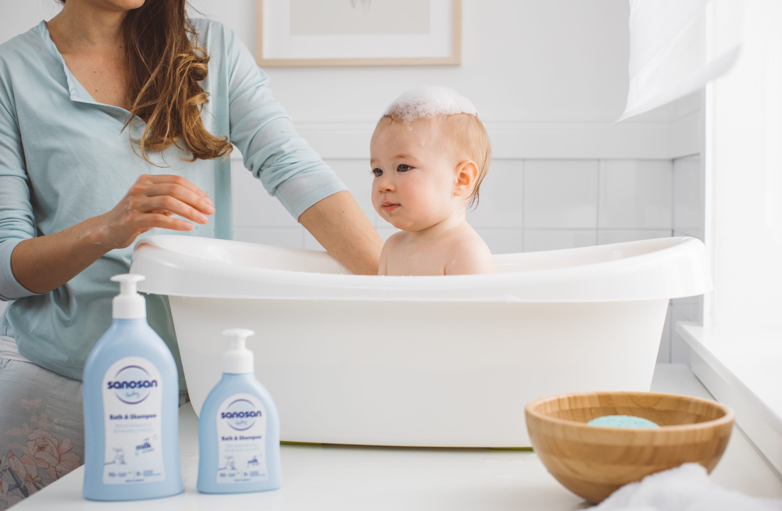 · Keep the water temperature at a cozy 36–37°C. · Choose moisturizing bath products like Sanosan’s Baby Bath & Shampoo, which cleanses while preventing dryness.
